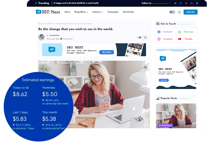 A responsive website is crucial in a world where mobile communication takes precedence. This is why the SEO Next template is responsive. It ensures that your blog performs effectively on all devices, ranging from desktops to smartphones.